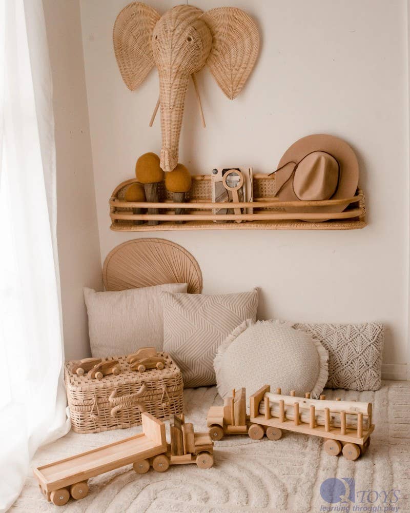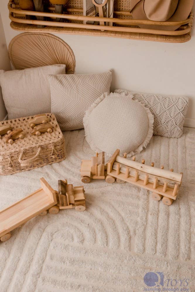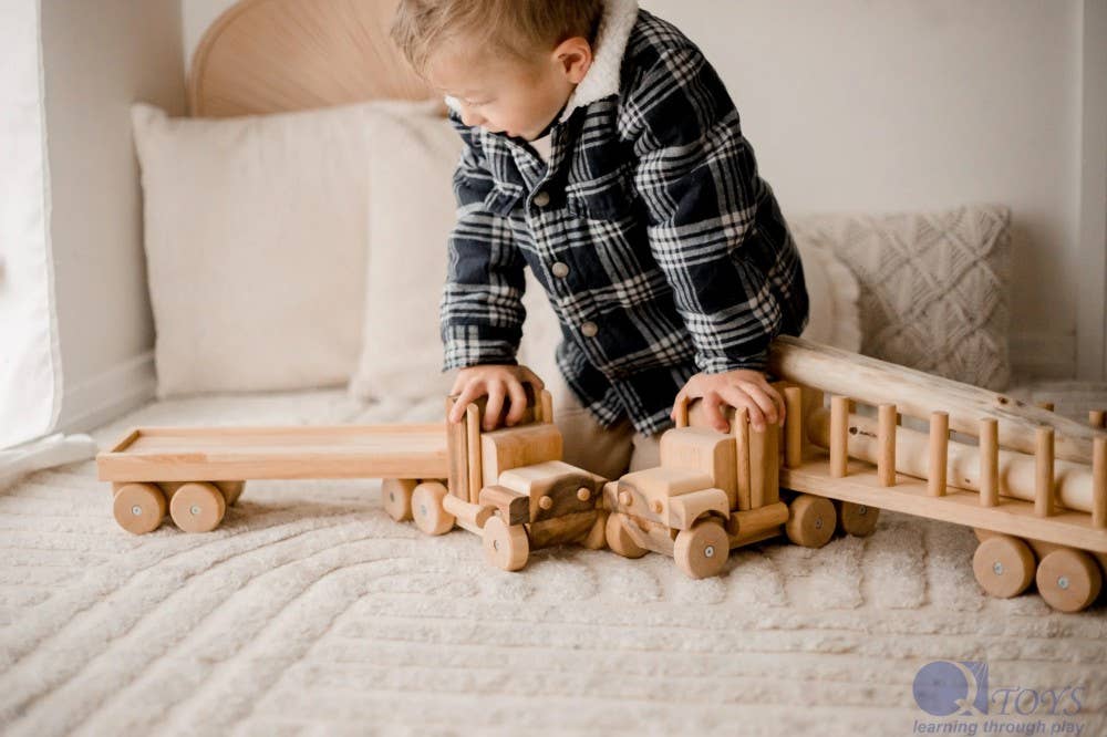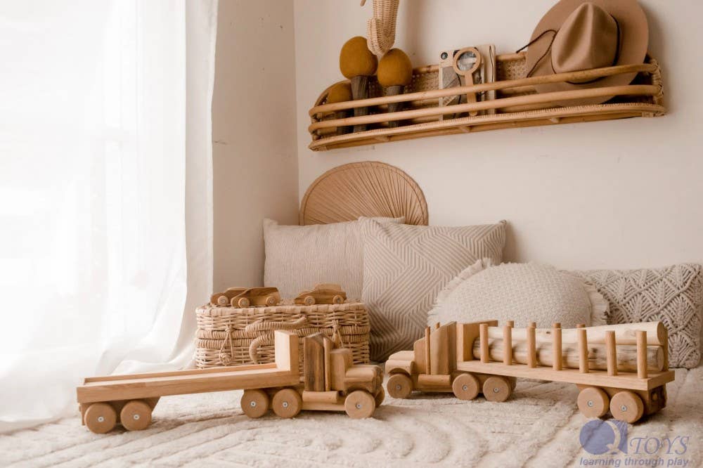 Introducing the Qtoys Log Truck, a delightful, vintage-style, handmade truck. This log truck features a detachable cabin and a trailer loaded with wooden logs, providing endless opportunities for imaginative play. Children will love loading and unloading the logs, sparking their creativity and engaging in hours of fun. The versatile design of the log truck allows for various play scenarios, enhancing the overall play experience.