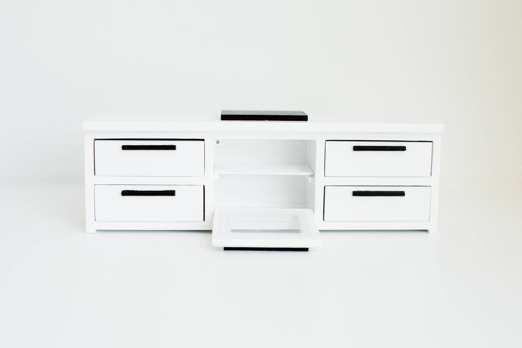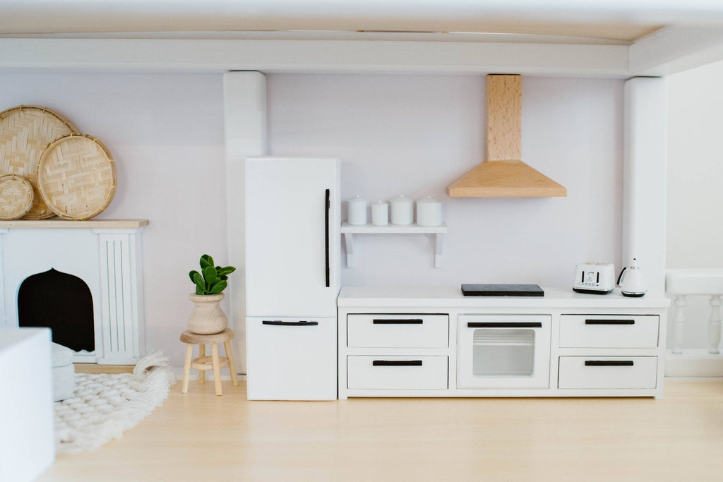 Macy Mae's Dollhouse Kitchen Base Cabinets with Cooktop and Stove feature a realistic and modern design that mirrors contemporary kitchen aesthetics. From the sleek cabinet doors to the intricately designed cooktop and stove, every detail exudes authenticity. You will love the functioning drawers and oven door for storage all the tiny things.