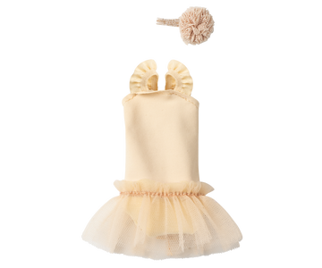 The perfect set for a ballet lesson. The set contains a cream-colored leotard, tutu skirt and hair pompom and fits the bunny size 1 .