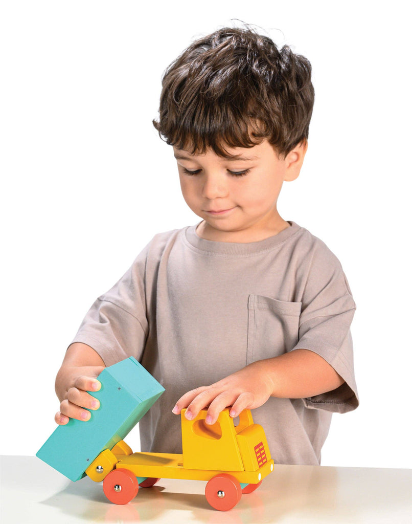 A Big Yellow Lorry truck. Based on a retro design, the simple clean lines give this traditional toy a refreshing look and feel. A classic big yellow lorry with tipping back part and orange wheels. A classic and timeless quality toy.